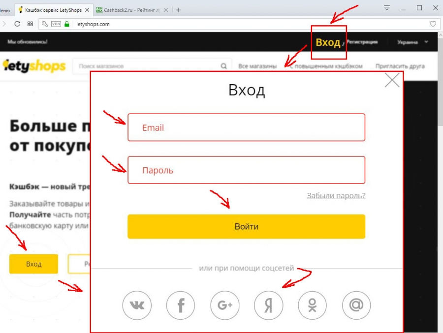 Чтобы получить кэшбэк за покупки, сначала авторизуйтесь на сайте https://letyshops.com (нажмите кнопку “Вход” вверху справа), после чего укажите свой логин (email), пароль и нажмите кнопку “Войти”.